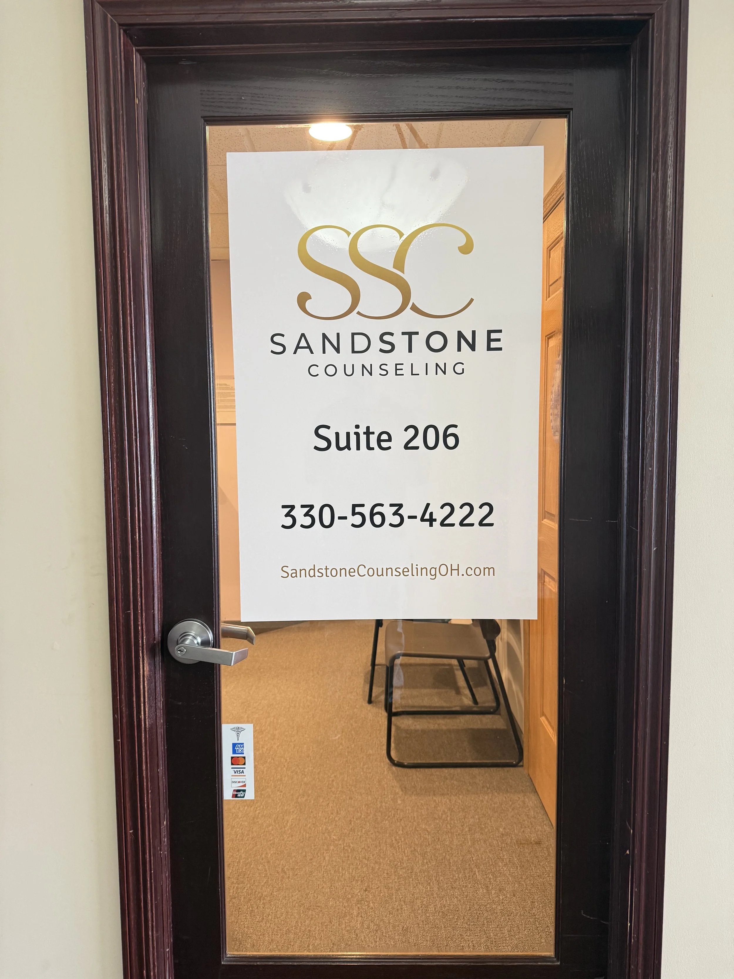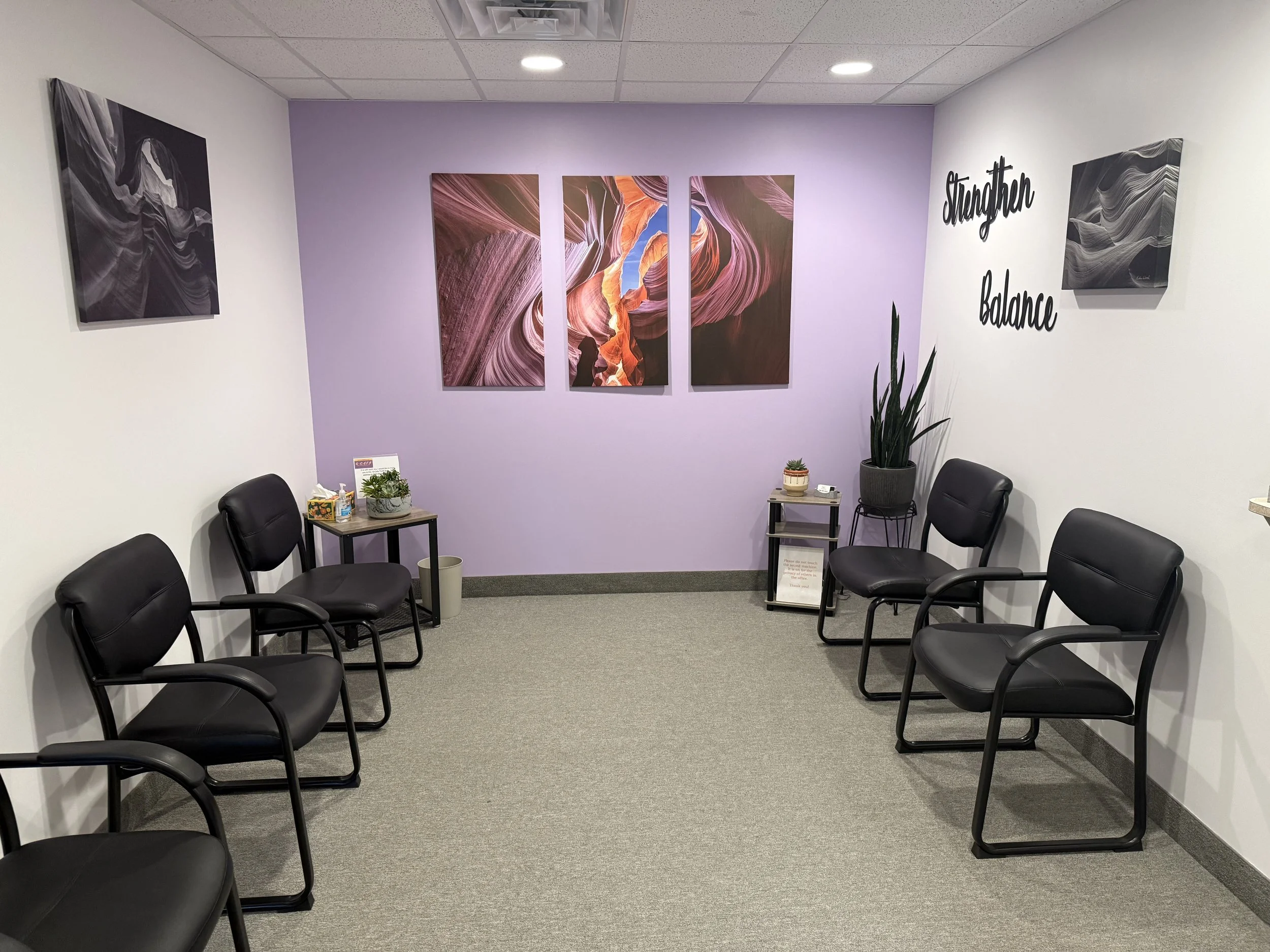 Sandstone waiting room. Tri-panel picture of sandstone on the back wall. A black and white picture of sandstone rock is on the right wall. The words Strength and Balance are on the right all along with a smaller black and white photo.