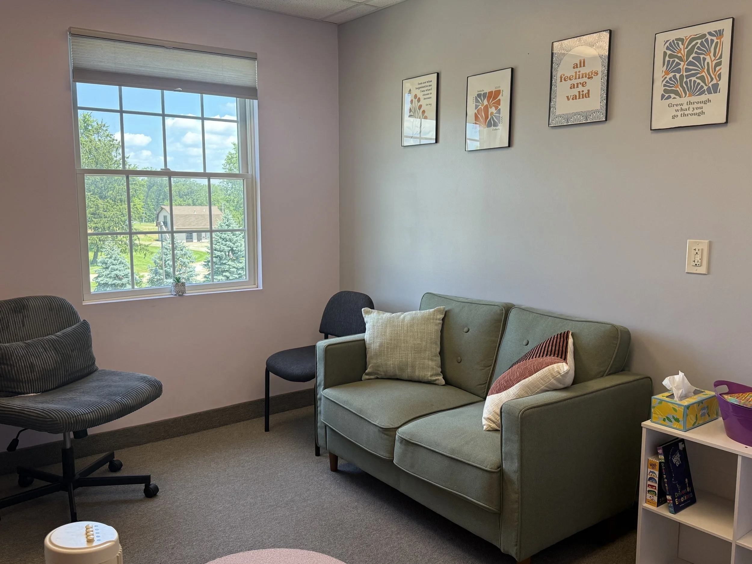 Sandstone office four. A window on the far wall with a couch along the wall to the right.