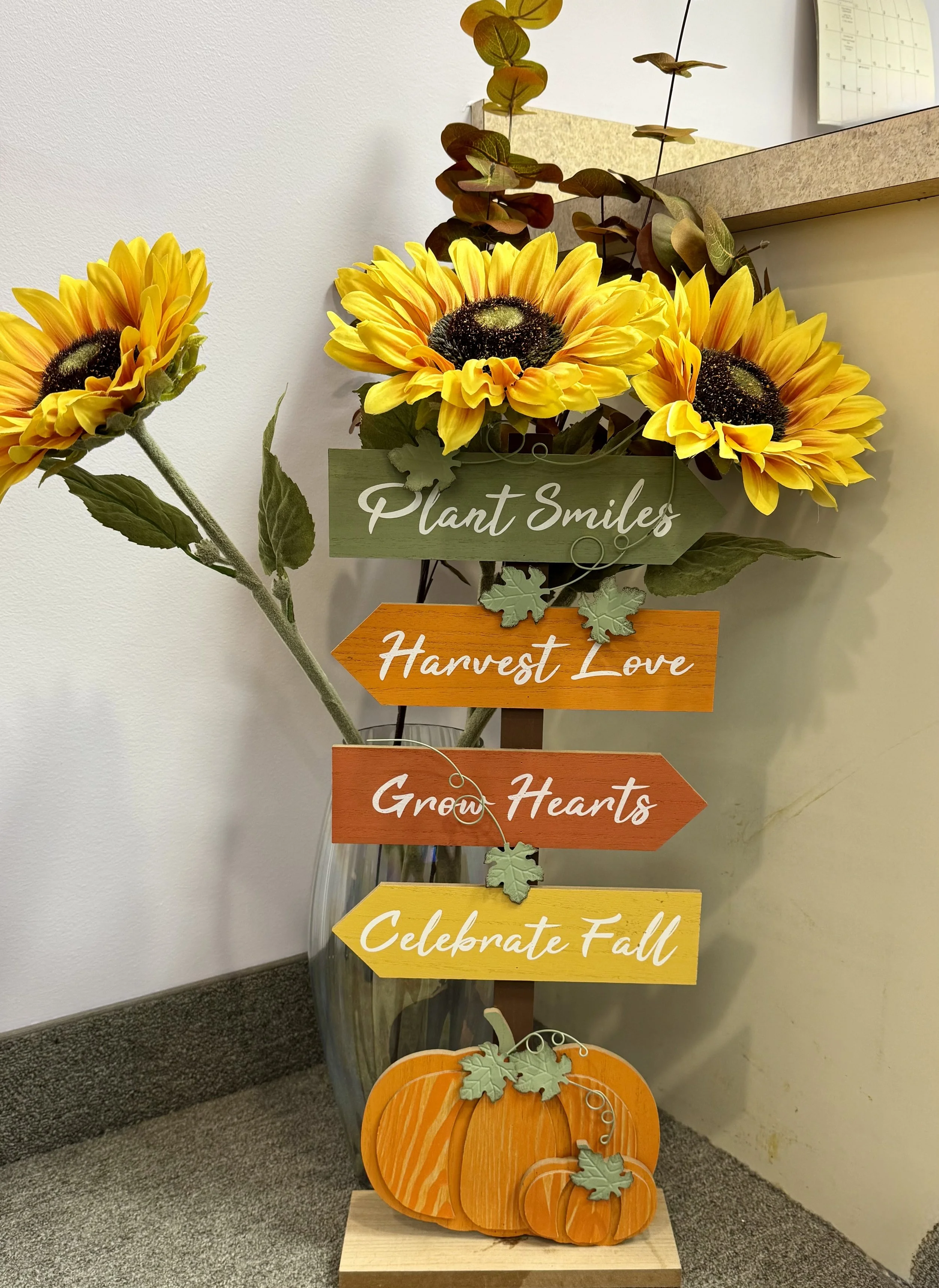 Sunflowers on signs for fall that says plant smiles, harvest love, grow hears, and celebrate fall.
