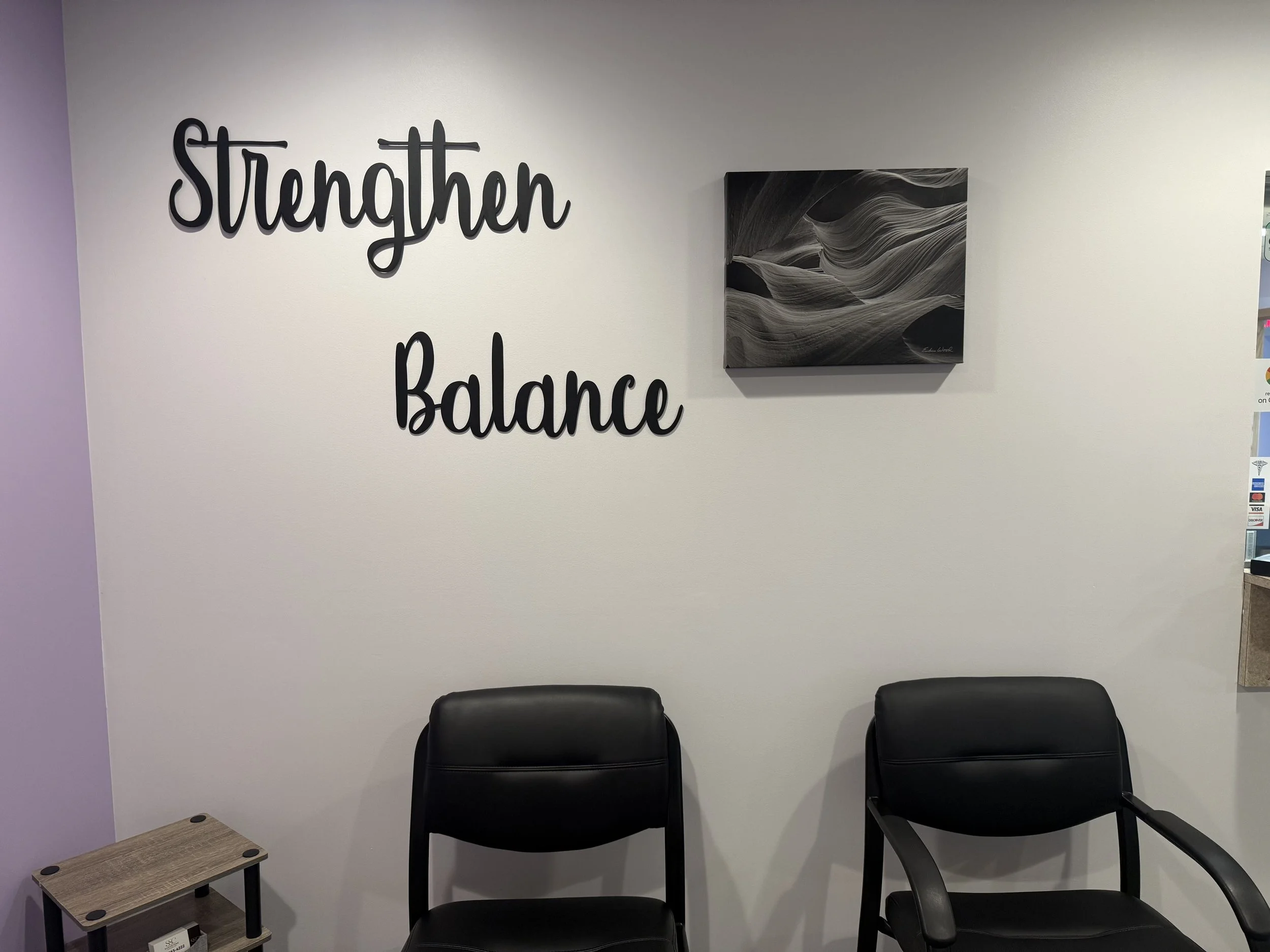 Sandstone waiting room wall with the words Strength and Balance on the back wall along with a black and white picture of sandstone waves.