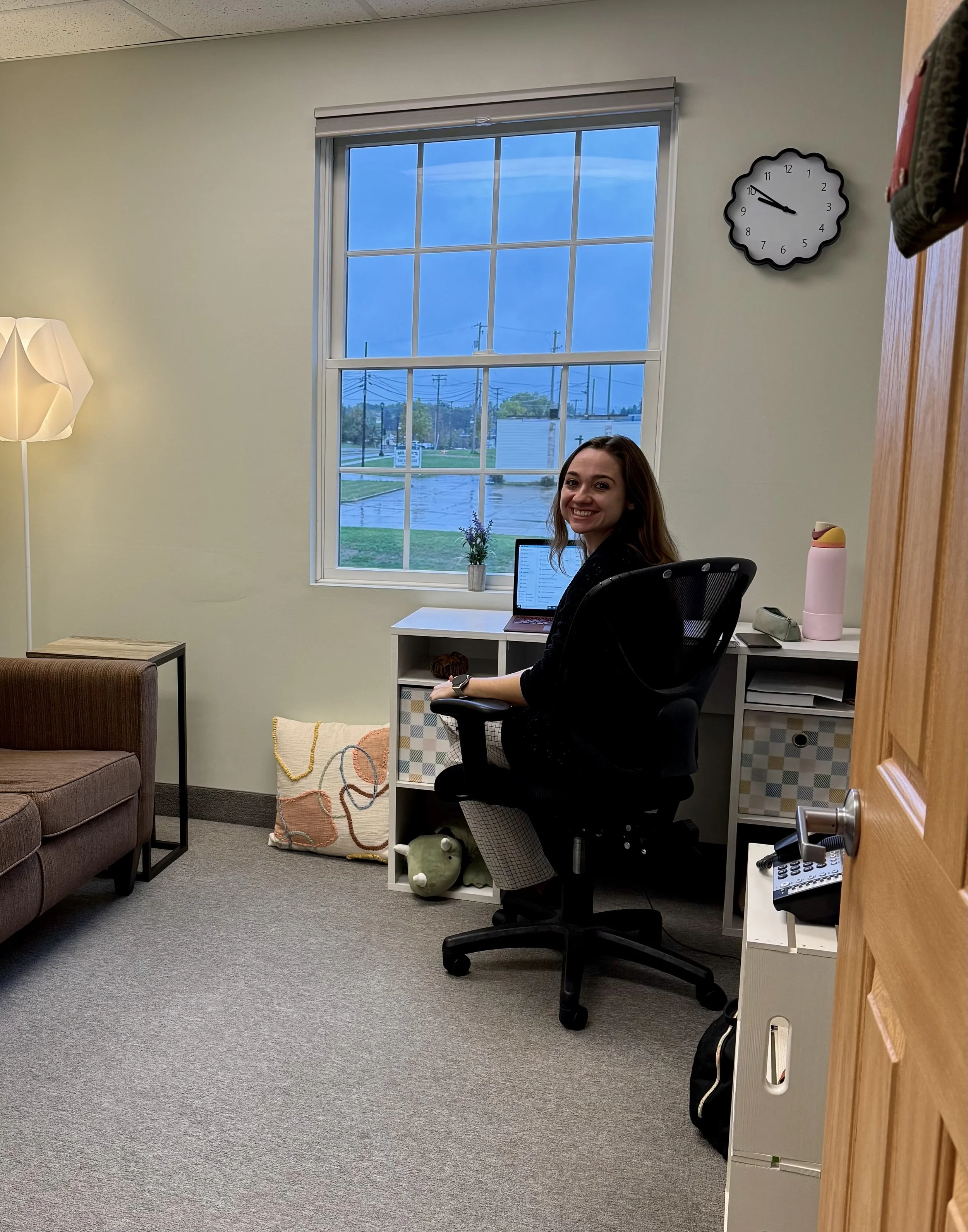 Sandy sitting at her desk and turned around in her chair smiling at the camera.
